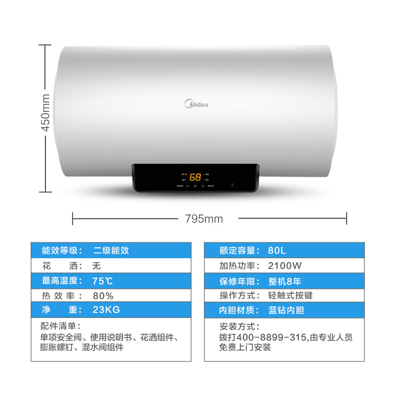 商品名称:Midea/美的 F6021-X1(S)热水器储水式 家用洗澡电热水器抑菌节能 直降150 购买送净水器+花洒套装